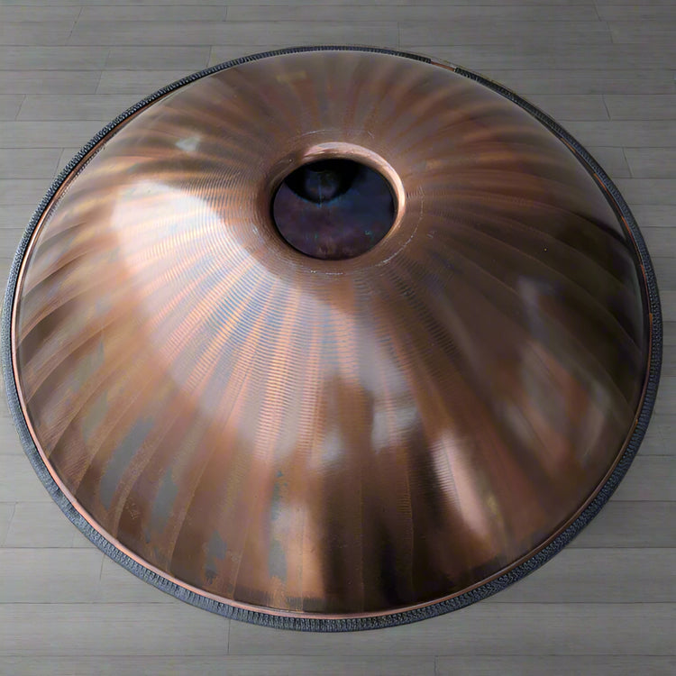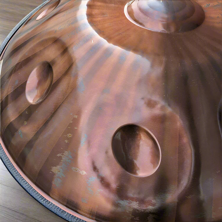 Sichtbare Hammer-Spuren, die durch das präzise Stimmen des Instruments per Hand entstehen, sind charakteristische Merkmale handgefertigter Handpans. Sie zeugen von der authentischen Handwerkskunst und stellen keinen Qualitätsmangel dar. Vielmehr unterstreichen sie die Einzigartigkeit jedes Instruments.