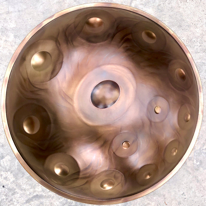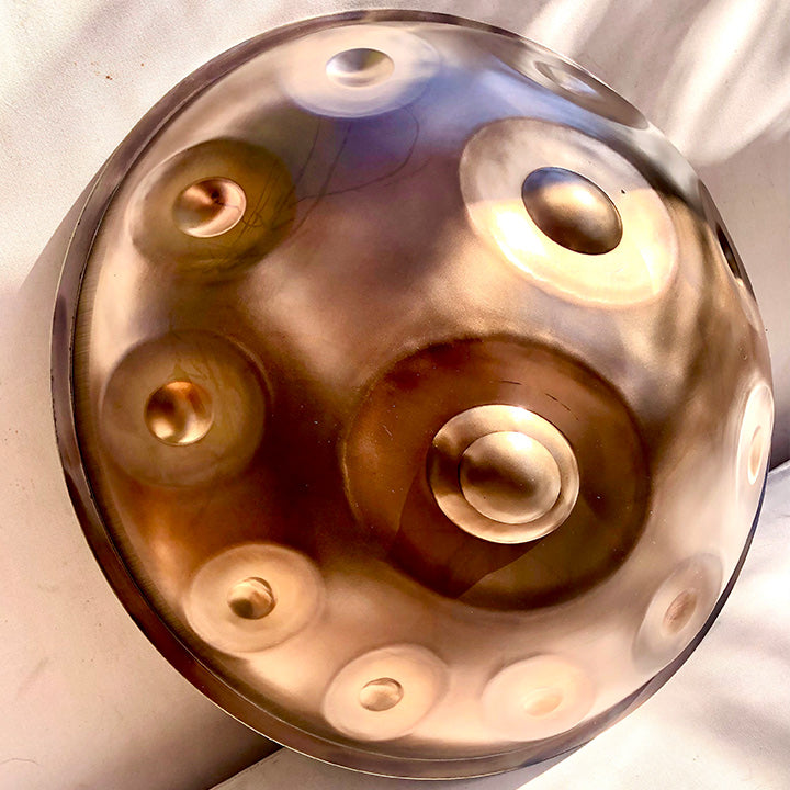 Our handpans are elaborately crafted by hand. Even though our handpans are made with the utmost care and craftsmanship, natural differences in color, slight variations in design and minimal manufacturing marks, such as fine scratches or unevenness on the tone fields and the sound body, may occur.