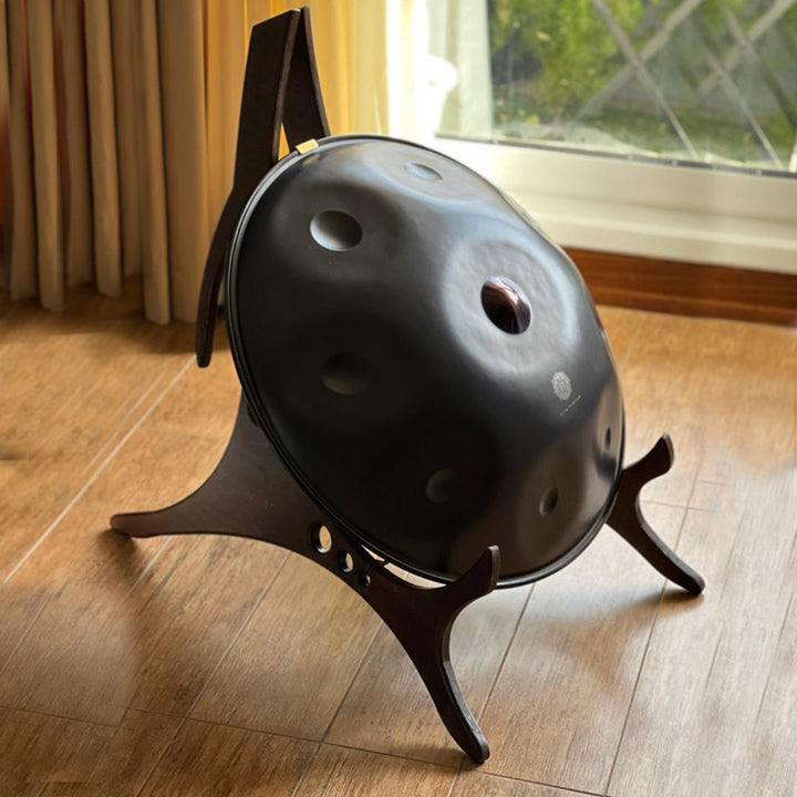 Auf ihm liegt eine Handpan aus nitriertem Stahl. Der Katanui Deko Stand ist der perfekte Handpan Halter für Dein Handpan Drum Instrument.